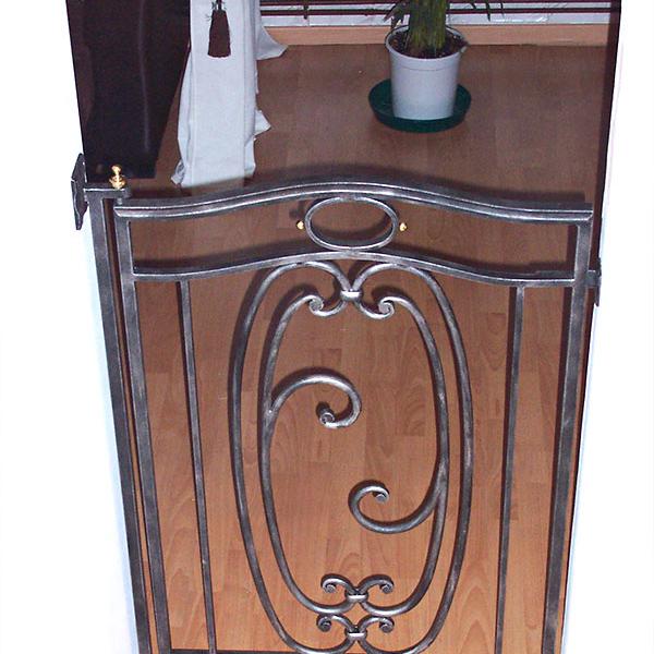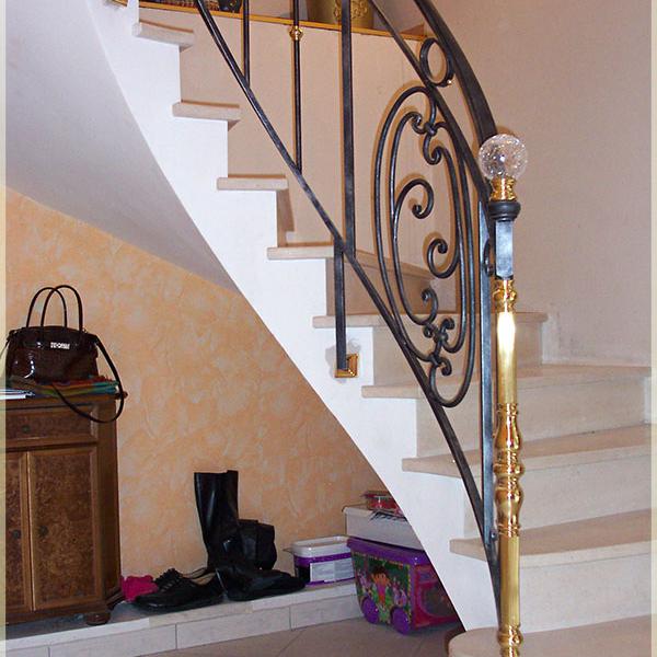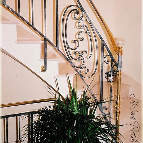 La composition de nos rampes : Lisse haute et basse en fer plat de 20x15 mm - Main courante en fer ou en laiton - Montants porteurs en fer carré de 20x20 mm - Décor en fer plat de 20x8 mm par volute - Barreaudage en fer rond de 14 mm.