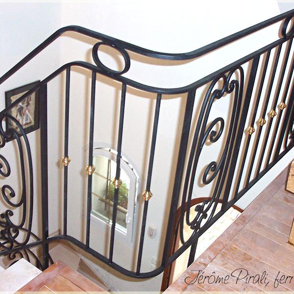 Cette rampe d'escalier aux décors mixtes peut être réalisée par Jérôme Renaire, RJ Ferronnerie, partout en France.
