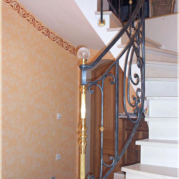 Ce modèle mixte de rampe d'escalier très léger avec son motif de style Louis XVI est moins prisé par nos clients mais reste très élégant avec ses barreaux avec bagues en laiton. Sa main courante laiton poli lui donne des signes de noblesse.