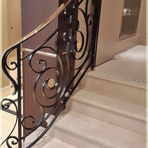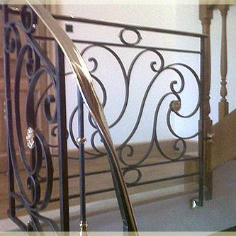 La composition de nos rampes : Lisse haute et basse en fer plat de 20x15 mm - Main courante en fer ou en laiton - Montants porteurs en fer carré de 20x20 mm - Décor en fer plat de 20x8 mm par volute - Barreaudage en fer rond de 14 mm.
