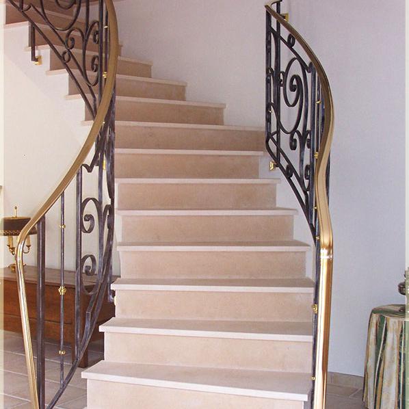 La composition de nos rampes : Lisse haute et basse en fer plat de 20x15 mm - Main courante en fer ou en laiton - Montants porteurs en fer carré de 20x20 mm - Décor en fer plat de 20x8 mm par volute - Barreaudage en fer rond de 14 mm.