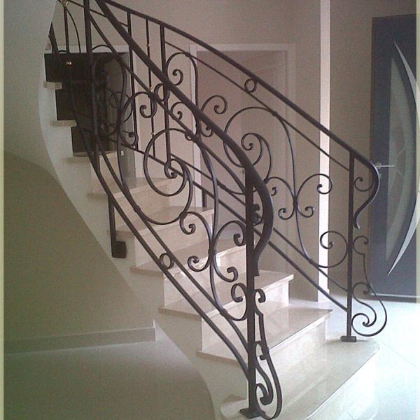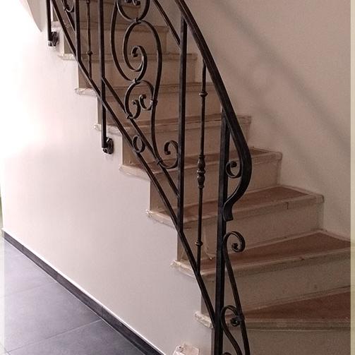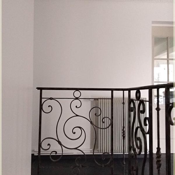 - rampe en fer forgé avec volutes en plat de 20 x 8 mm et barreaux avec bagues en fonte