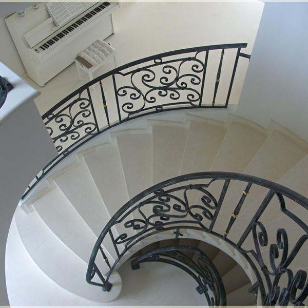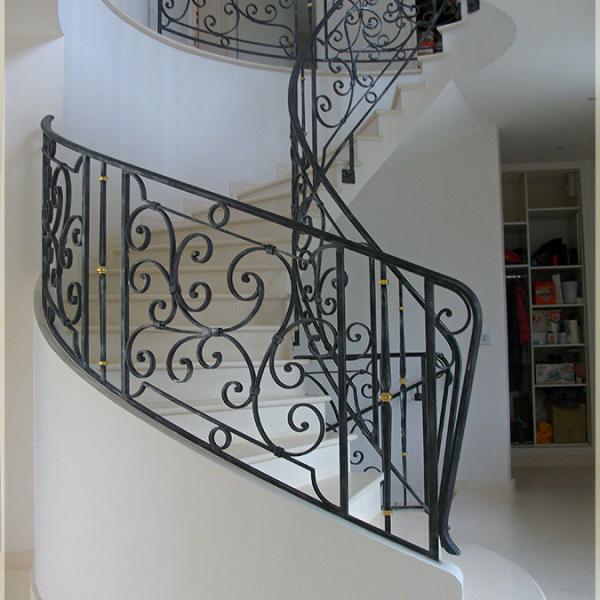 Cette rampe d'escalier aux décors arrondis peut être réalisée par Jérôme Renaire, RJ Ferronnerie, partout en France.