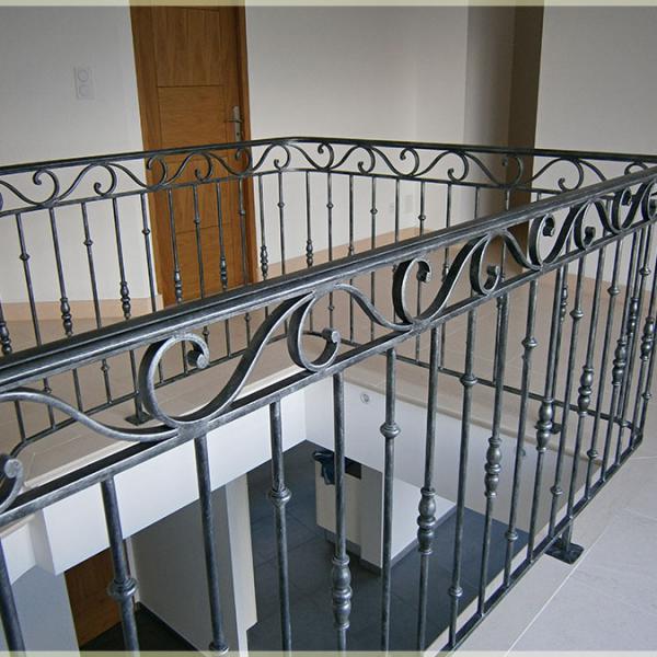 - Rampe à barreaux en fer rond de 14 mm avec bagues en laiton poli et vernis ainsi que des motifs par volutes en fer plat de 20 x 8 mm
