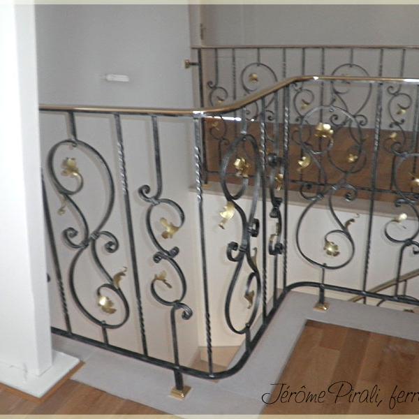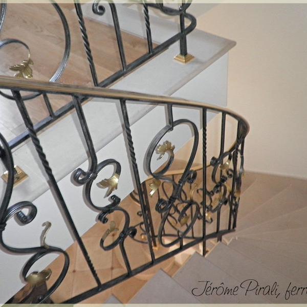 Ce modèle de rampe classique très ample avec un travail de forge sur les volutes en forme de feuilles, beaucoup moins répandu dans notre patrimoine. Sa main courante en Laiton poli illumine l'escalier.