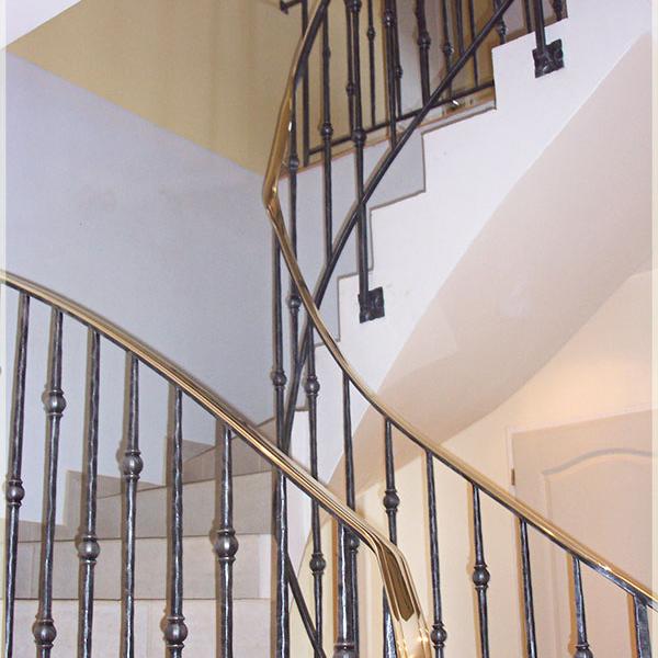 La composition de nos rampes : Lisse haute et basse en fer plat de 20x15 mm - Main courante en fer ou en laiton - Montants porteurs en fer carré de 20x20 mm - Décor en fer plat de 20x8 mm par volute - Barreaudage en fer rond de 14 mm.