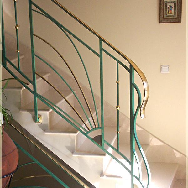 Le modèle Soleil est classé dans la catégorie des rampes d'escalier de style Art décoratif, c'est un modèle géométrique sobre et élégant dont le motif est fait d'un faisceau de fer plat et laiton. Il reste très prisé par nos clients recherchent un modèle très contemporain.