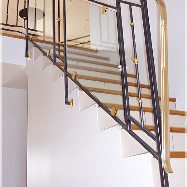La composition de nos rampes : Lisse haute et basse en fer plat de 20x15 mm - Main courante en fer ou en laiton - Montants porteurs en fer carré de 20x20 mm - Décor en fer plat de 20x8 mm par volute - Barreaudage en fer rond de 14 mm.