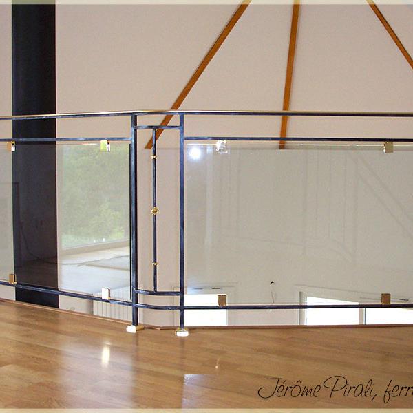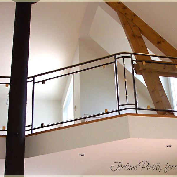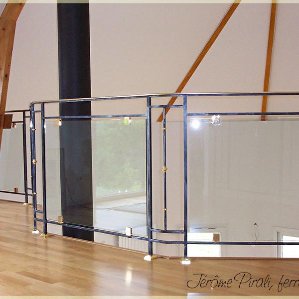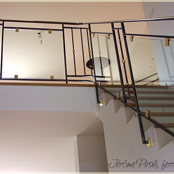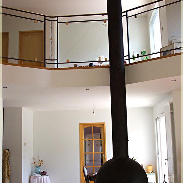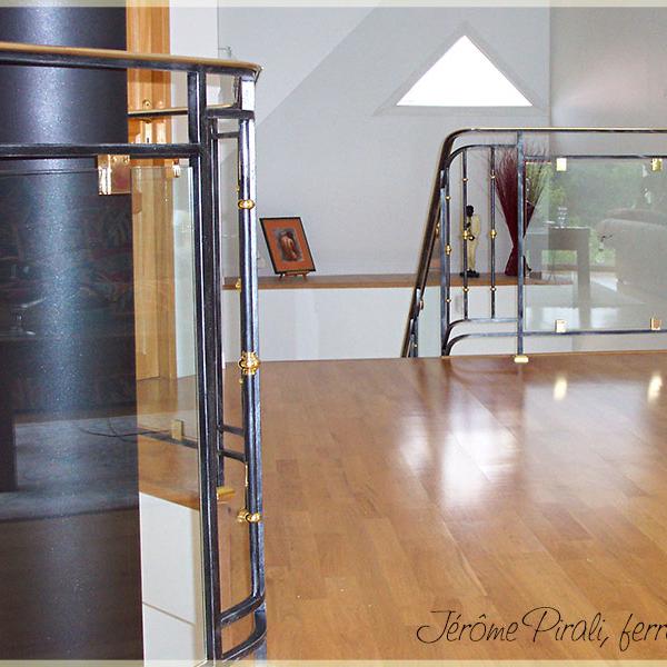 Cette rampe d'escalier mêlant divers matériaux peut être réalisée par Jérôme Renaire, RJ Ferronnerie, partout en France.
