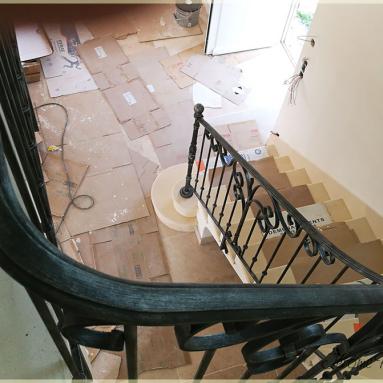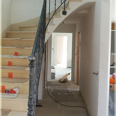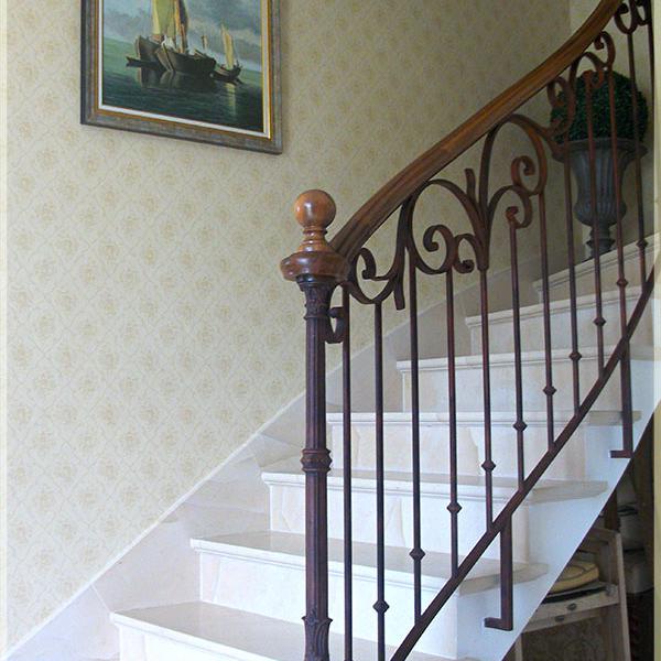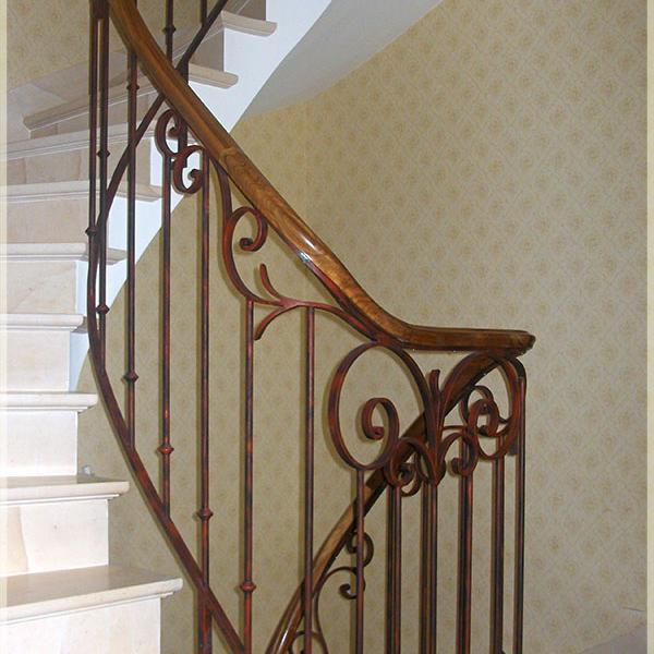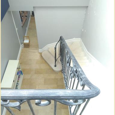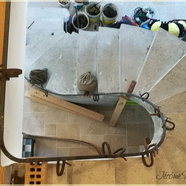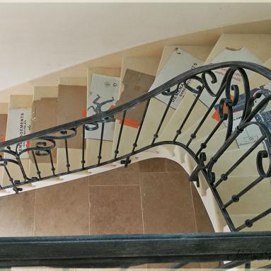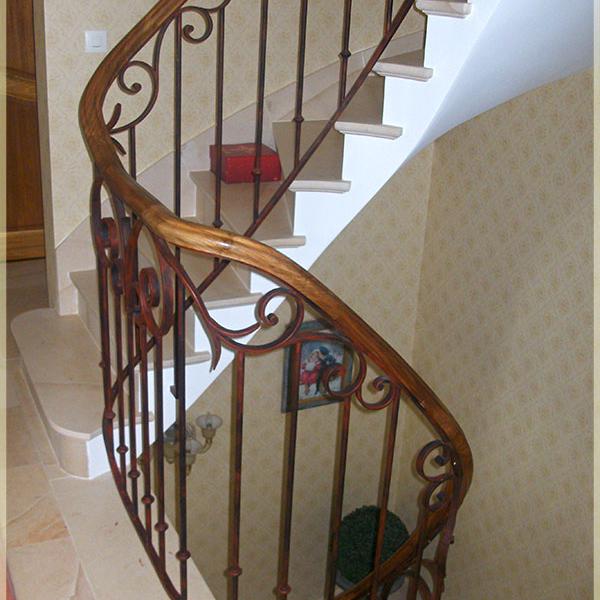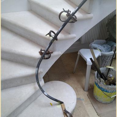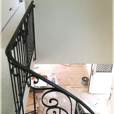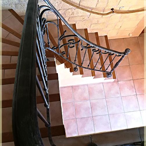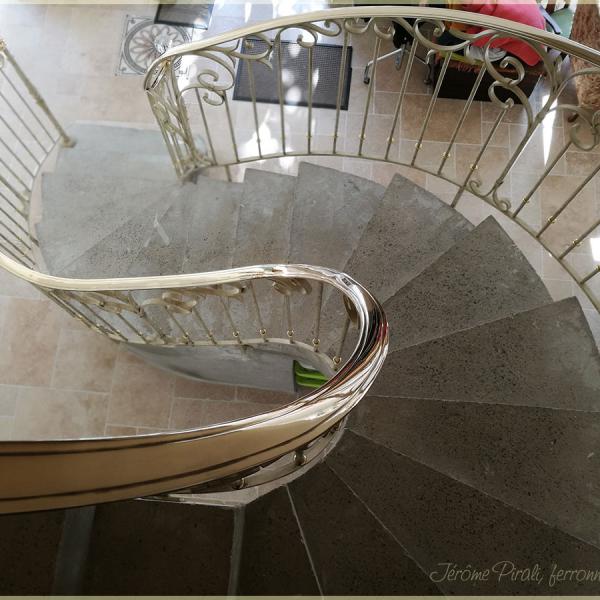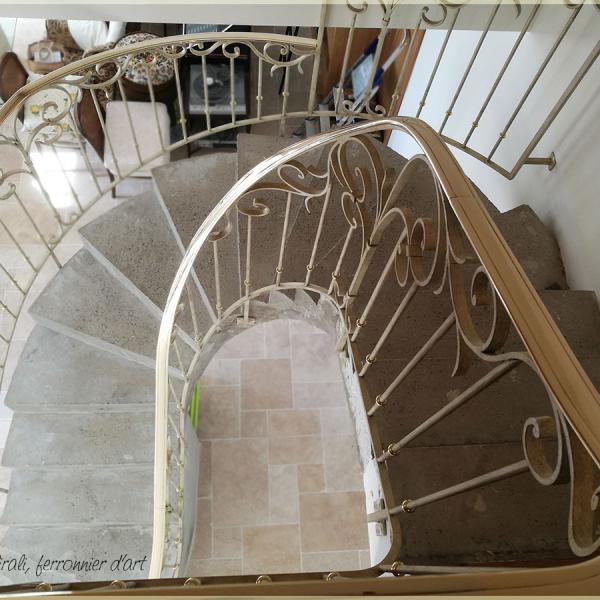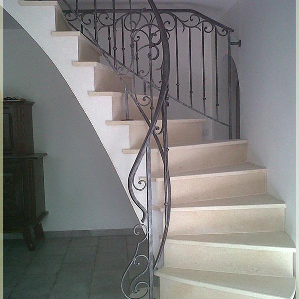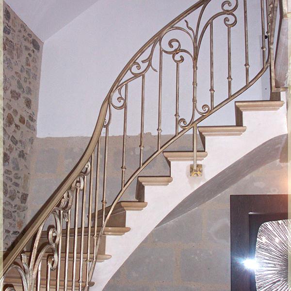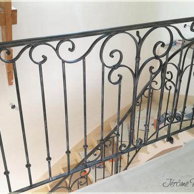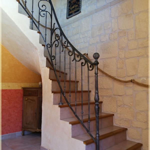Ce modèle mixte barreaux plus volutes convient à tout type d'escalier. Sur cet escalier en pierre il a trouvé sa place.