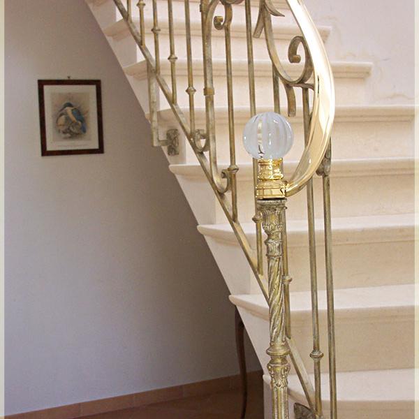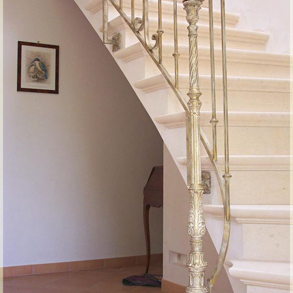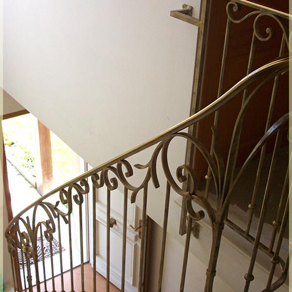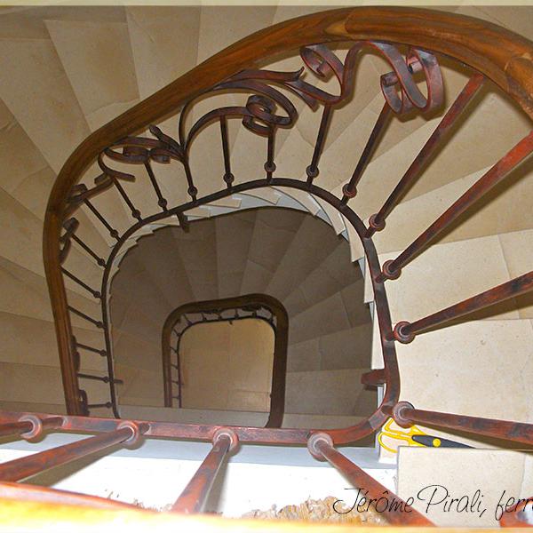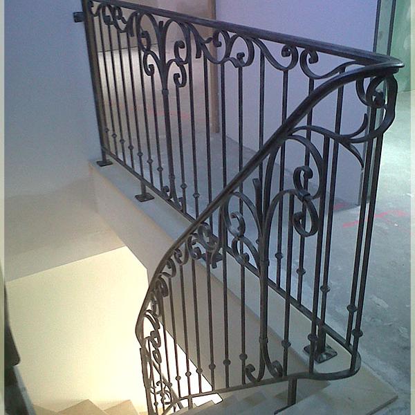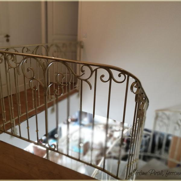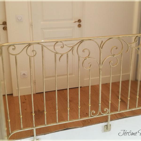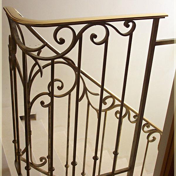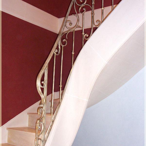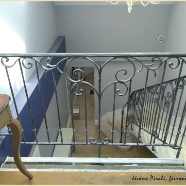- rampe à barreaux en fer rond de 14 mm avec bagues en fonte plus décor en partie haute par volutes en fer plat de 20 x 8 mm avec noyaux forgés