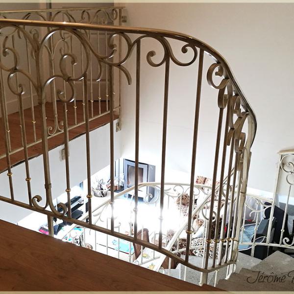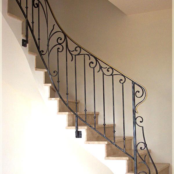 Ce modèle mixte barreaux plus volutes reste léger malgré la rampe de chaque coté. La main coutante en laiton souligne bien les formes de l'escalier en double S.