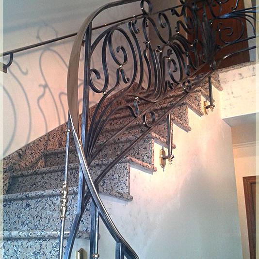 La composition de nos rampes : Lisse haute et basse en fer plat de 20x15 mm - Main courante en fer ou en laiton - Montants porteurs en fer carré de 20x20 mm - Décor en fer plat de 20x8 mm par volute - Barreaudage en fer rond de 14 mm.