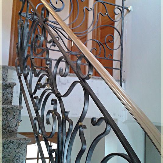 Ce modèle est classé dans le style arabesque Art Décoratif, c'est un modèle très ouvragé avec des volutes qui partent dans des courbes très douces sans coupure et reliées entre elle par des boules en laiton. Nous avons classé ce modèle dans la catégorie des rampes contemporaines Art décoratif.