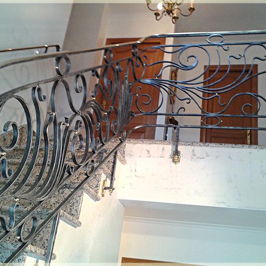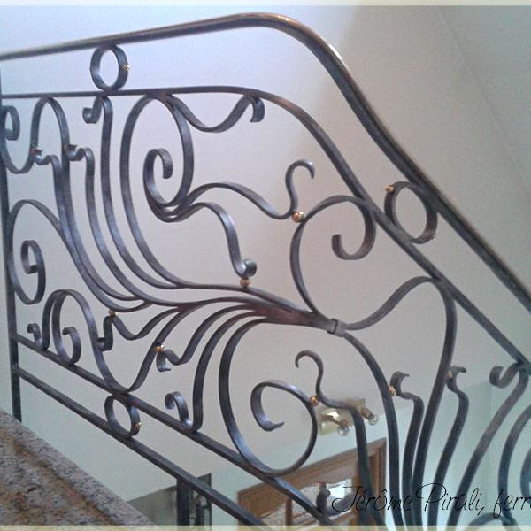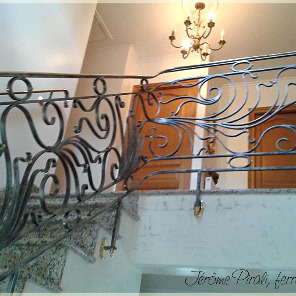 Cette rampe d'escalier aux motifs recherchés peut être réalisée par Jérôme Renaire, RJ Ferronnerie, partout en France.