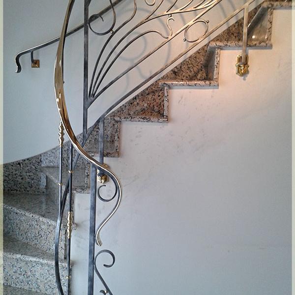 Rampe arabesque avec boules en laiton et volutes amincies à la forge