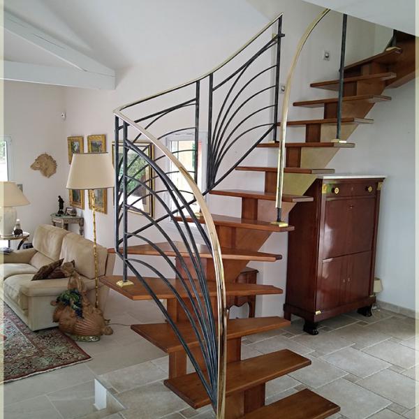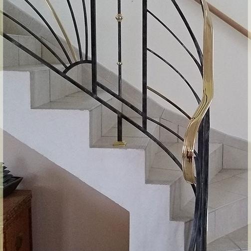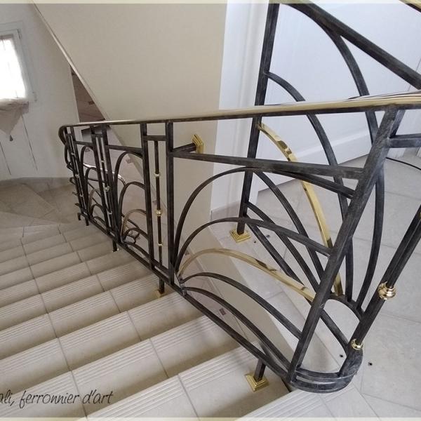 Le modèle Soleil est classé dans la catégorie des rampes d'escalier de style Art décoratif, c'est un modèle géométrique sobre et élégant dont le motif est fait d'un faisceau de fer plat et laiton. Il reste très prisé par nos clients recherchent un modèle très contemporain.