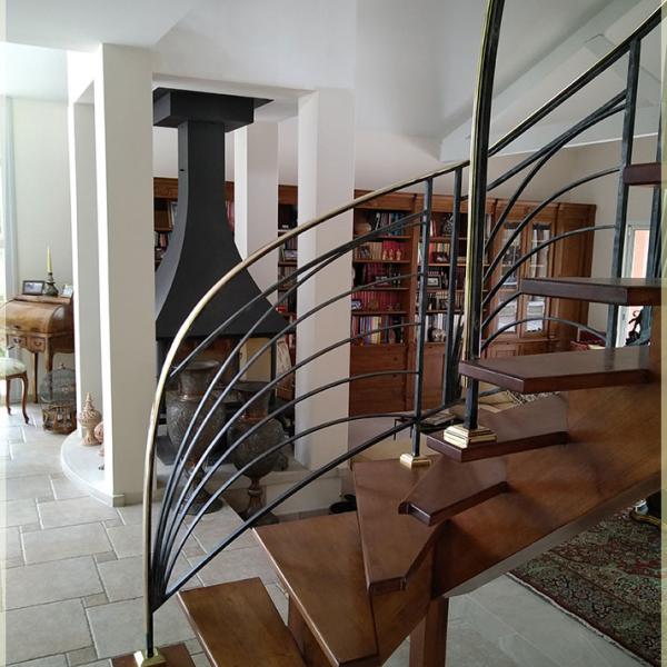 La composition de nos rampes : Lisse haute et basse en fer plat de 20x15 mm - Main courante en fer ou en laiton - Montants porteurs en fer carré de 20x20 mm - Décor en fer plat de 20x8 mm par volute - Barreaudage en fer rond de 14 mm.