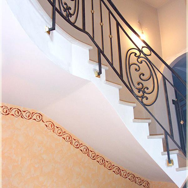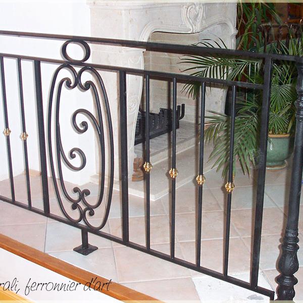 La composition de nos rampes : Lisse haute et basse en fer plat de 20x15 mm - Main courante en fer ou en laiton - Montants porteurs en fer carré de 20x20 mm - Décor en fer plat de 20x8 mm par volute - Barreaudage en fer rond de 14 mm.