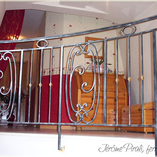 Cette rampe d'escalier aux décors mixtes peut être réalisée par Jérôme Renaire, RJ Ferronnerie, partout en France.