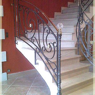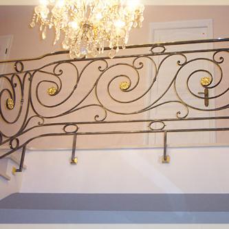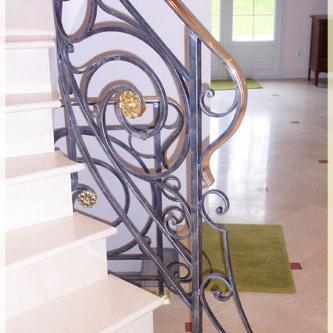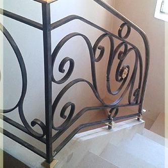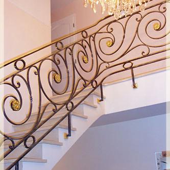 La composition de nos rampes : Lisse haute et basse en fer plat de 20x15 mm - Main courante en fer ou en laiton - Montants porteurs en fer carré de 20x20 mm - Décor en fer plat de 20x8 mm par volute - Barreaudage en fer rond de 14 mm.