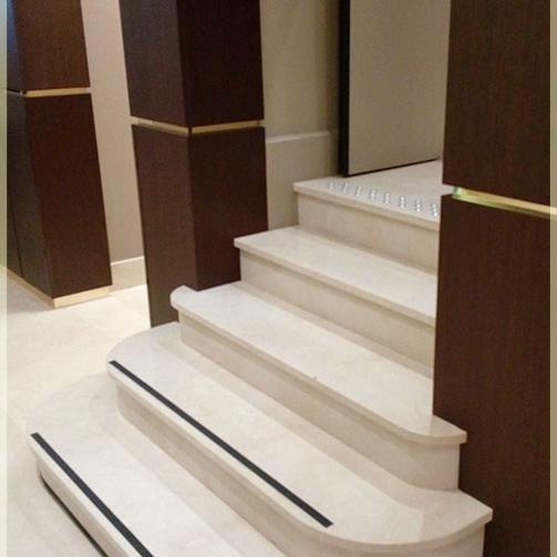 - fixations sur les marches à scellement avec platines cache en laiton poli vernis