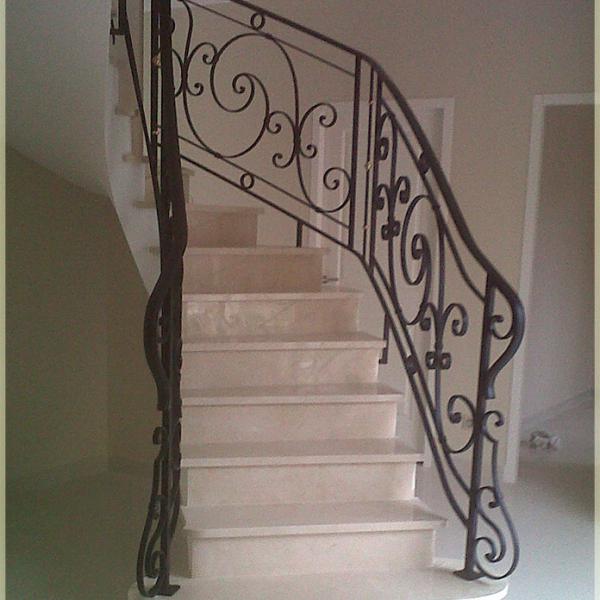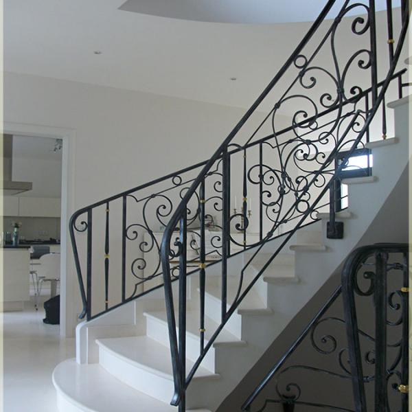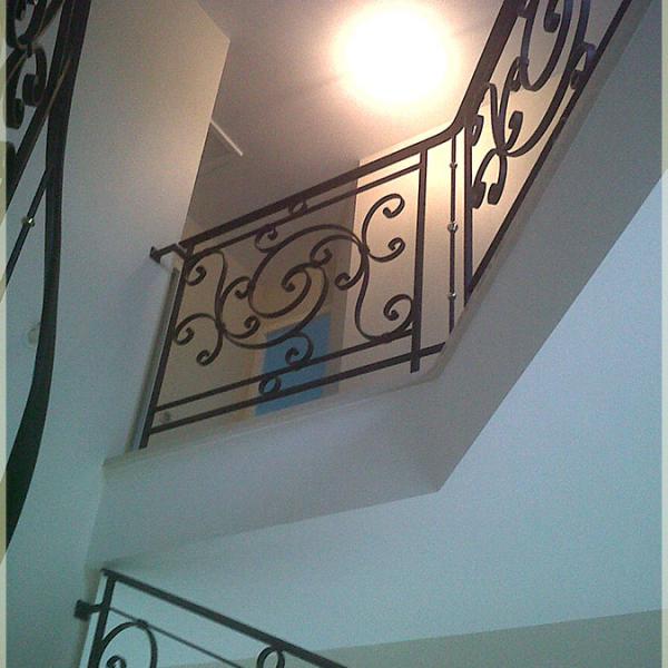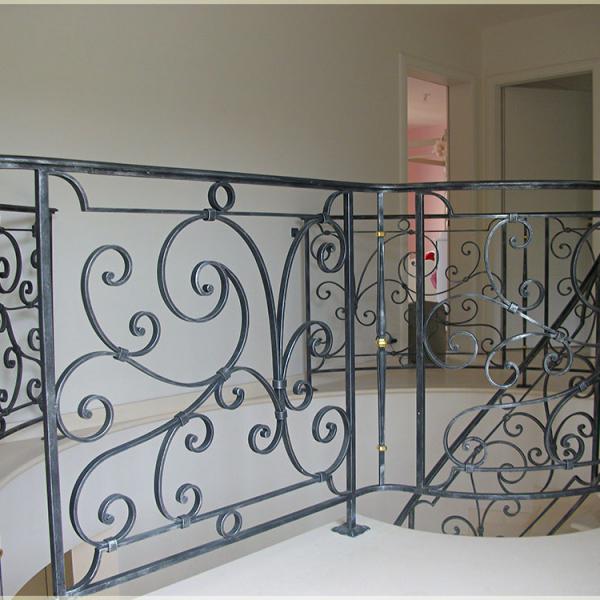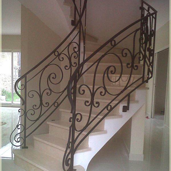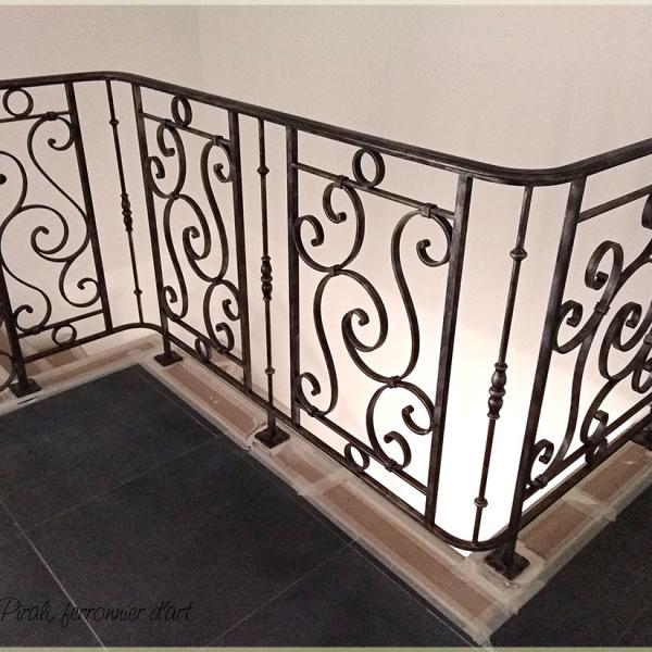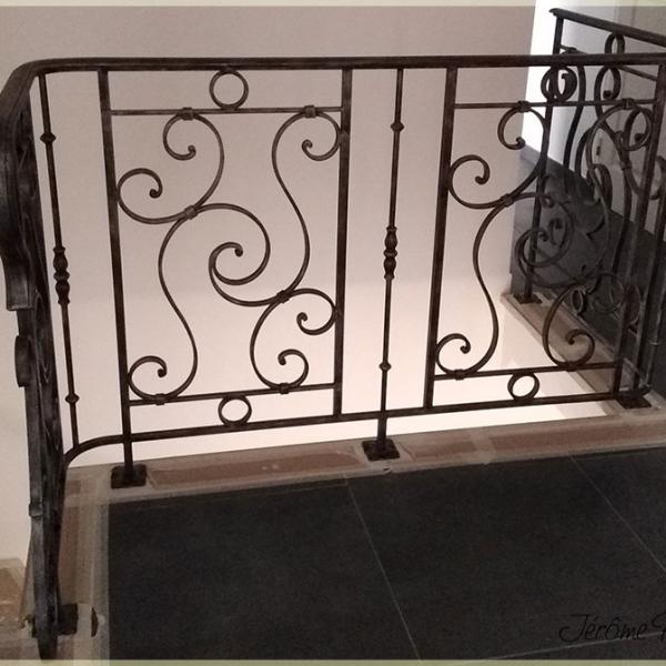 - rampe en fer forgé avec volutes en plat de 20 x 8 mm et barreaux avec bagues en fonte