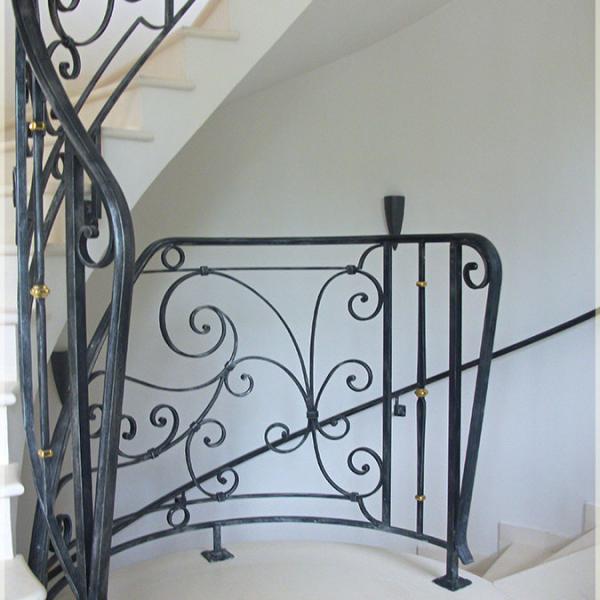 La composition de nos rampes : Lisse haute et basse en fer plat de 20x15 mm - Main courante en fer ou en laiton - Montants porteurs en fer carré de 20x20 mm - Décor en fer plat de 20x8 mm par volute - Barreaudage en fer rond de 14 mm.
