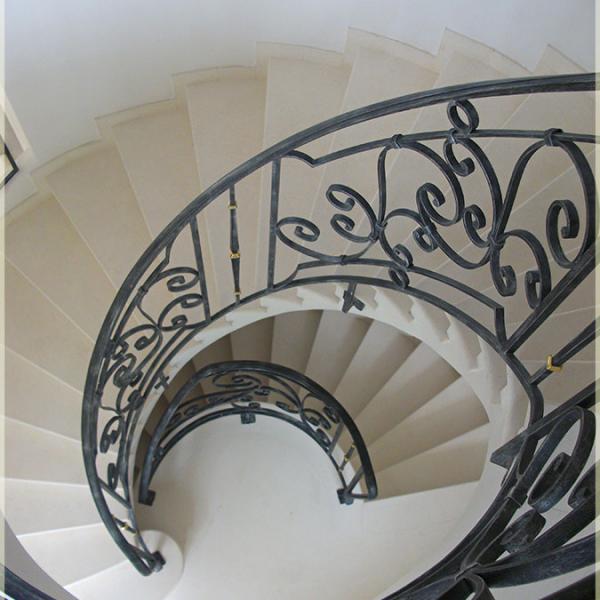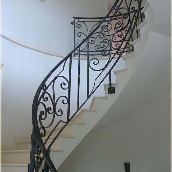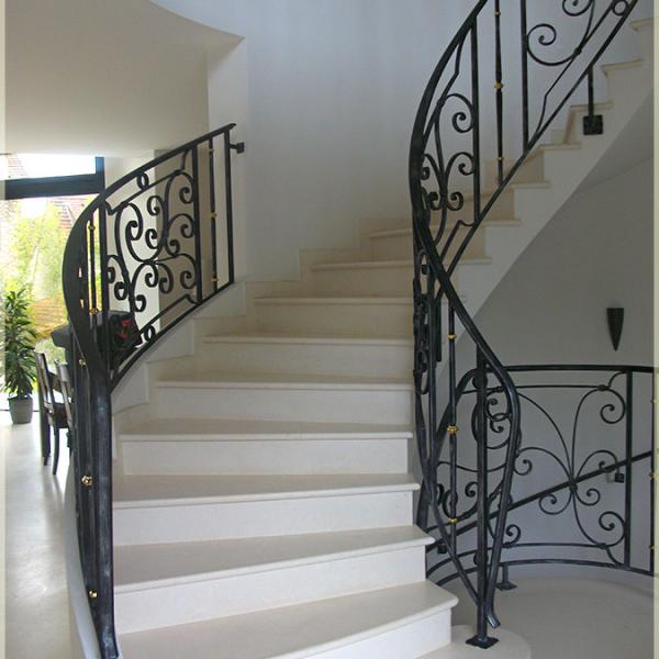 Cette rampe d'escalier aux décors arrondis peut être réalisée par Jérôme Renaire, RJ Ferronnerie, partout en France.