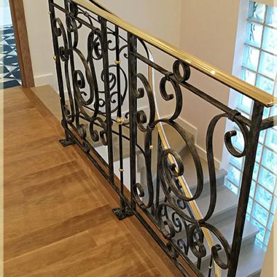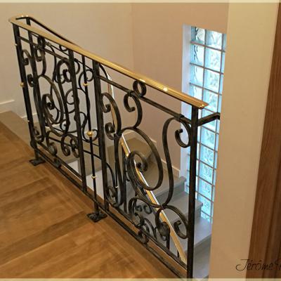 Rampe d'escalier modèle 5 a motif léger plus barreaudage avec main courante laiton, ainsi qu'une main courante laiton sur muret :