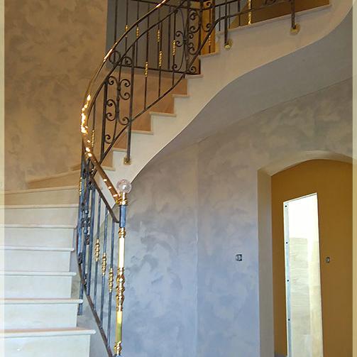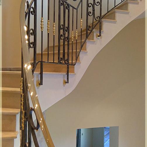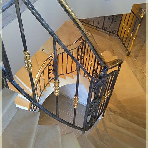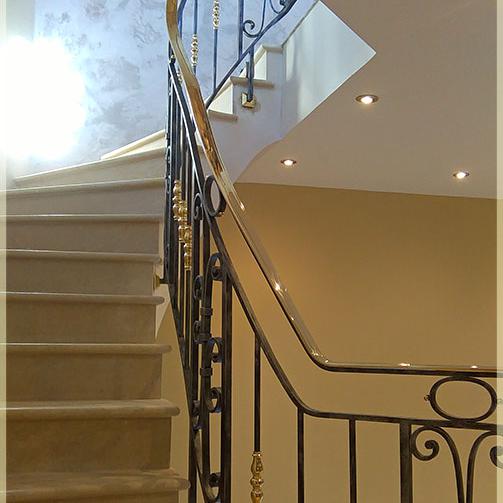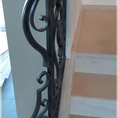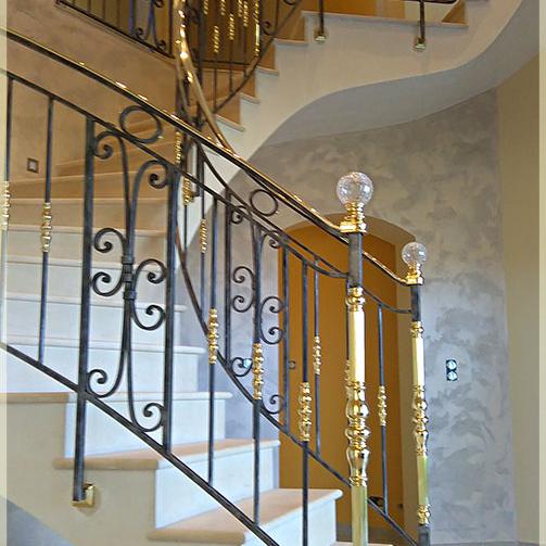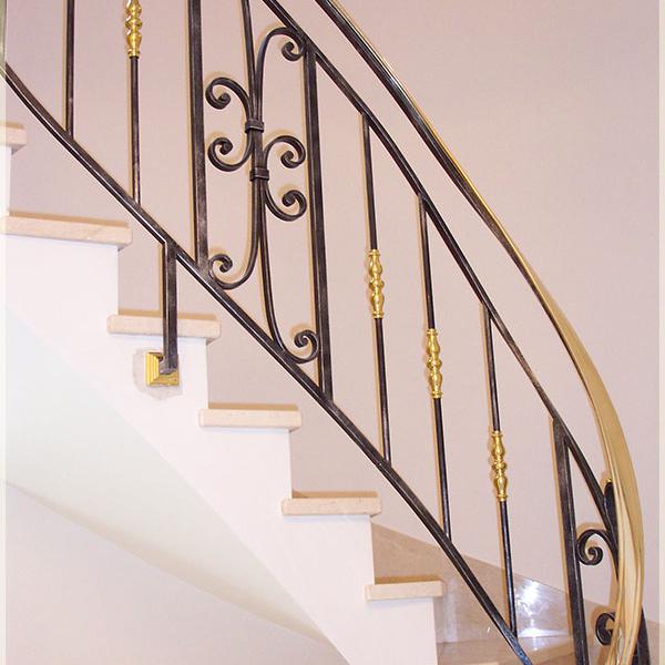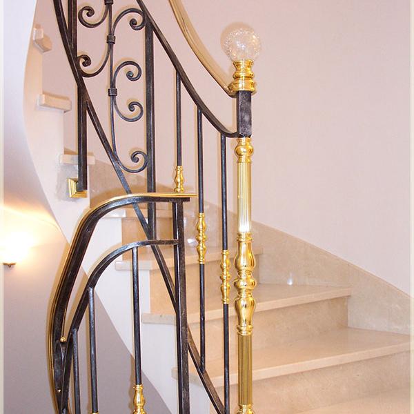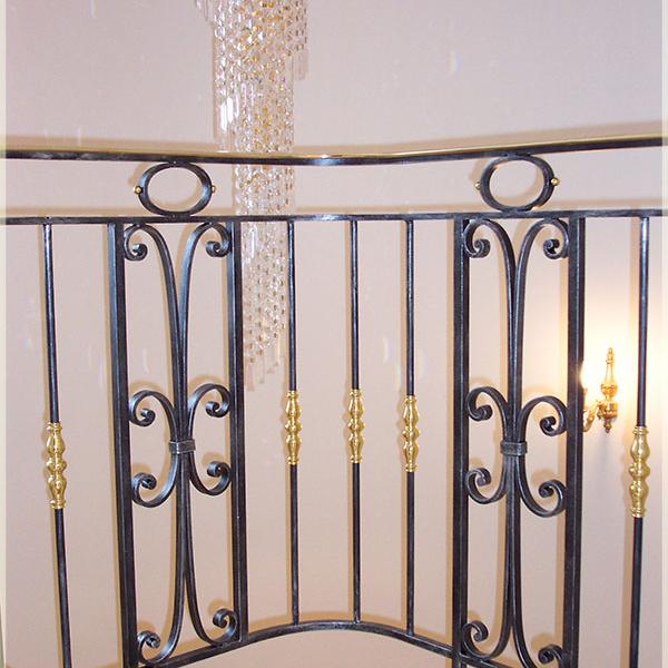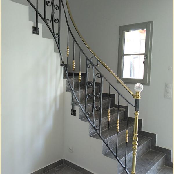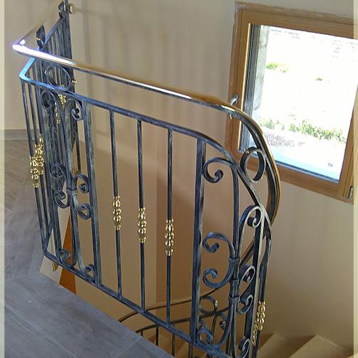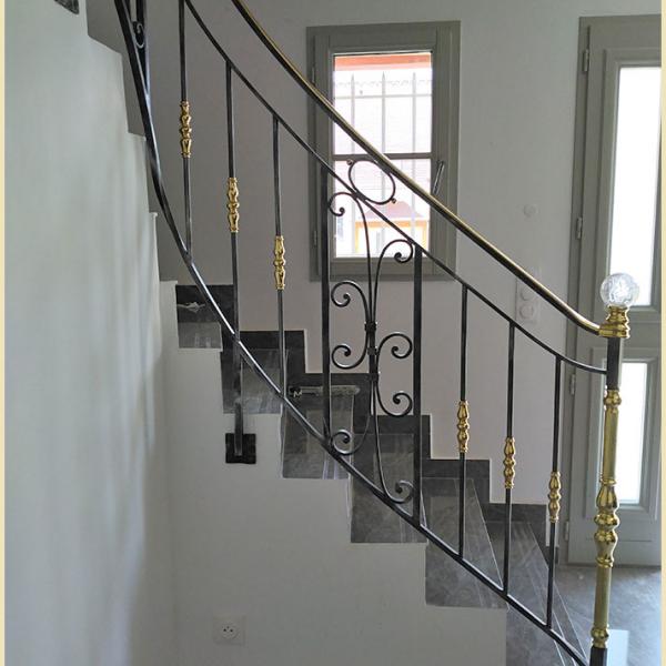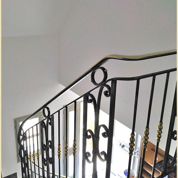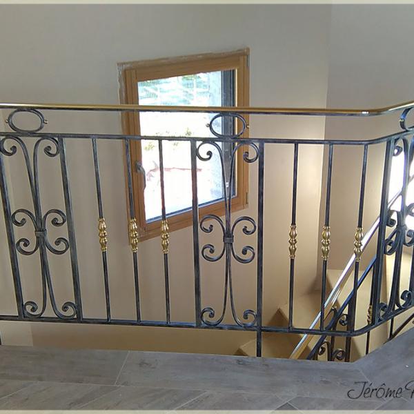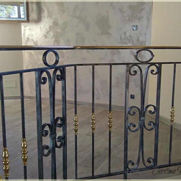 - Rampe à barreaux en fer rond de 14 mm avec bagues en laiton poli et vernis ainsi que des motifs par volutes en fer plat de 20 x 8 mm