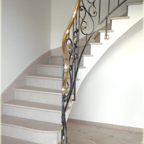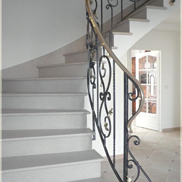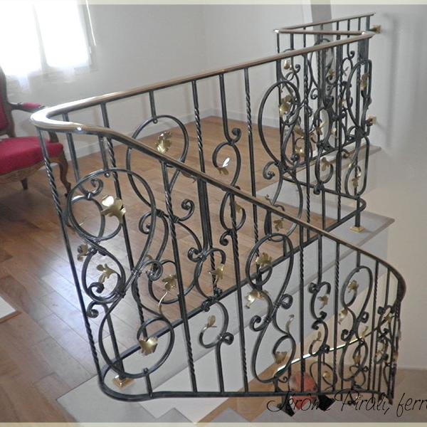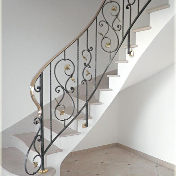 Ce modèle de rampe classique très ample avec un travail de forge sur les volutes en forme de feuilles, beaucoup moins répandu dans notre patrimoine. Sa main courante en Laiton poli illumine l'escalier.