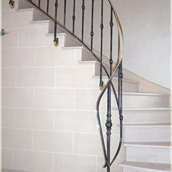 La composition de nos rampes : Lisse haute et basse en fer plat de 20x15 mm - Main courante en fer ou en laiton - Montants porteurs en fer carré de 20x20 mm - Décor en fer plat de 20x8 mm par volute - Barreaudage en fer rond de 14 mm.