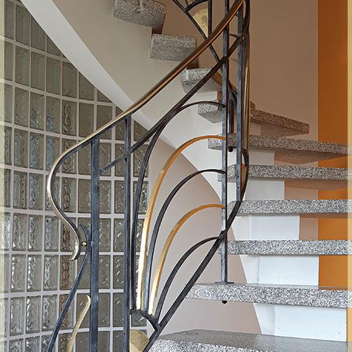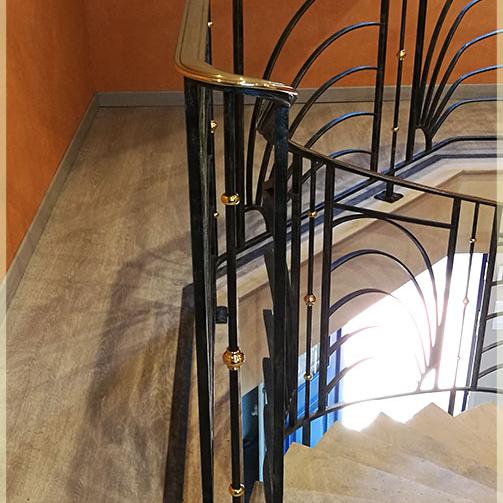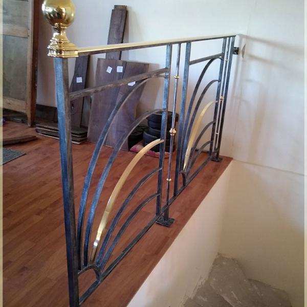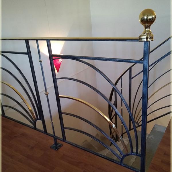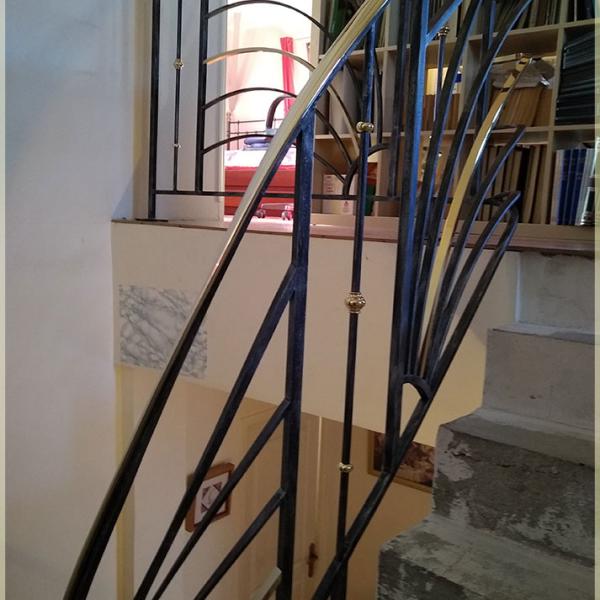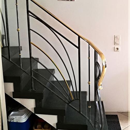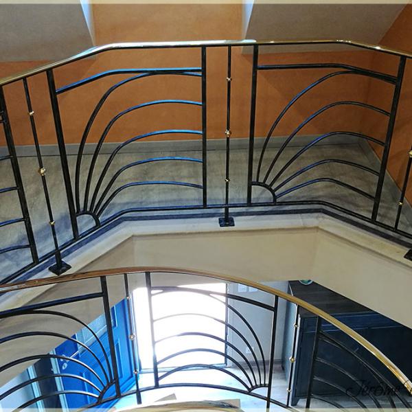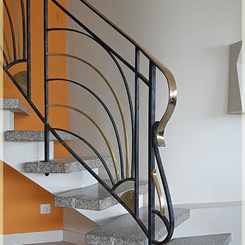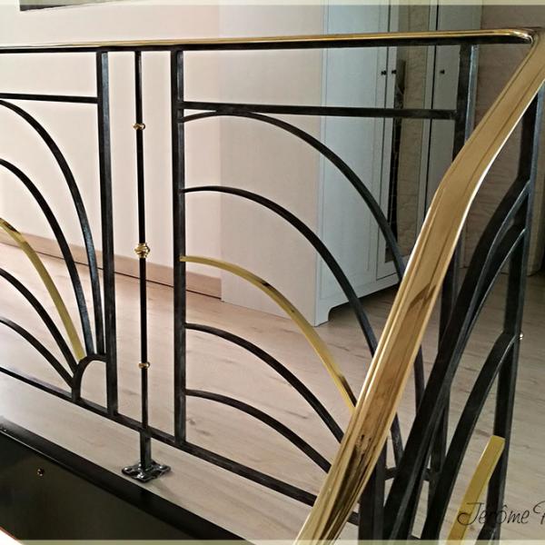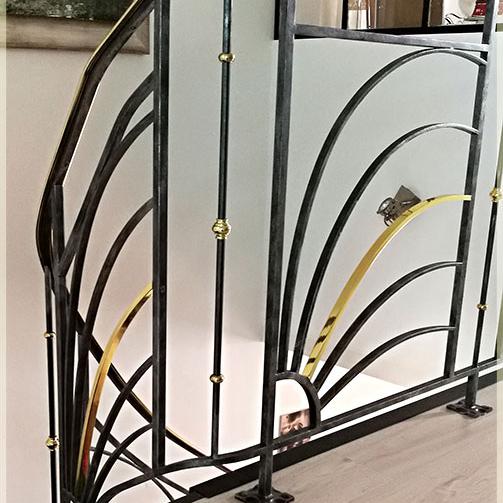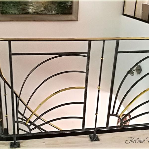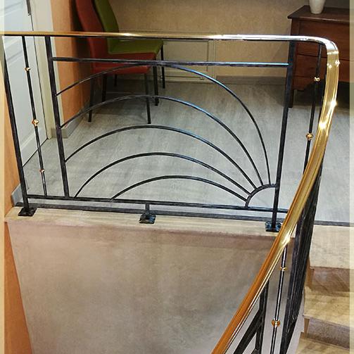 Le modèle Soleil est classé dans la catégorie des rampes d'escalier de style Art décoratif, c'est un modèle géométrique sobre et élégant dont le motif est fait d'un faisceau de fer plat et laiton. Il reste très prisé par nos clients recherchent un modèle très contemporain.