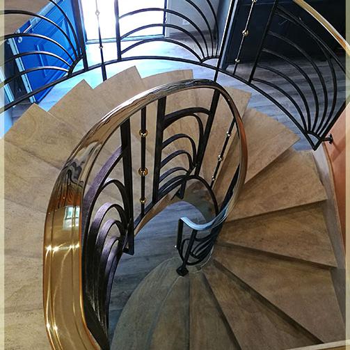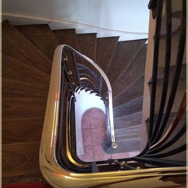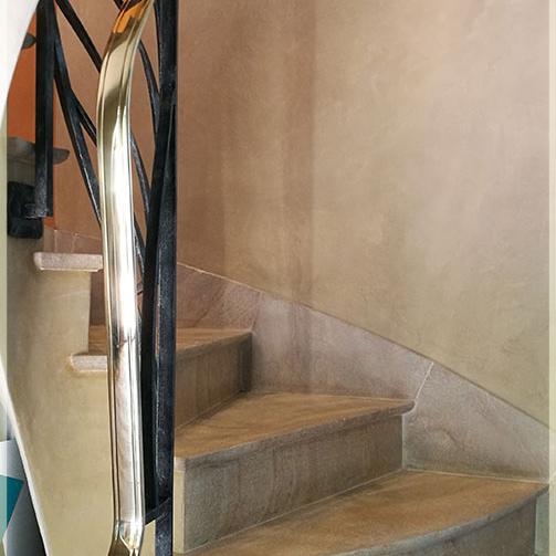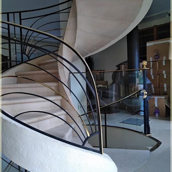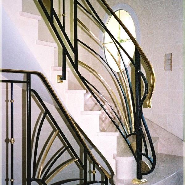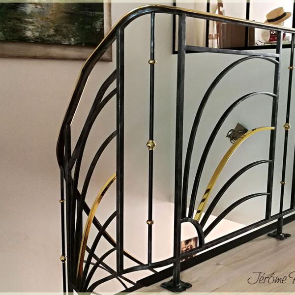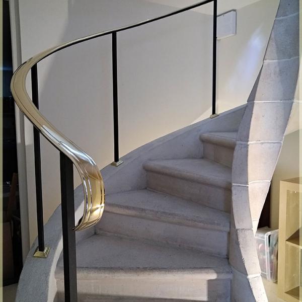 Ce modèle très Art Déco convient à tout type d'escalier, la main courante en laiton poli souligne les formes de la rampe.