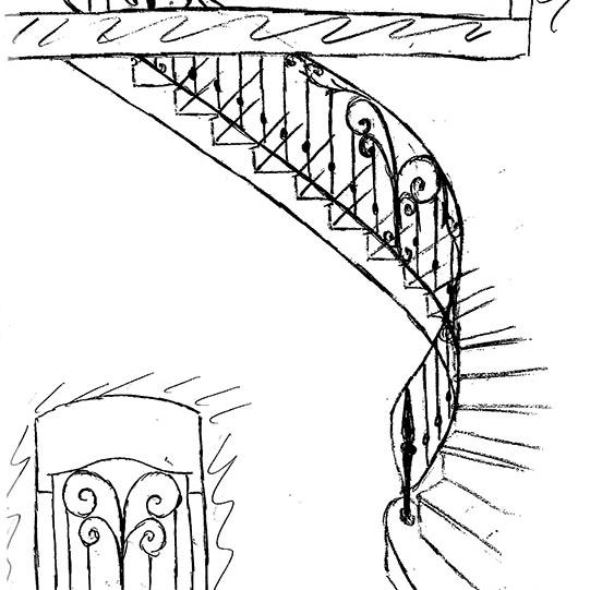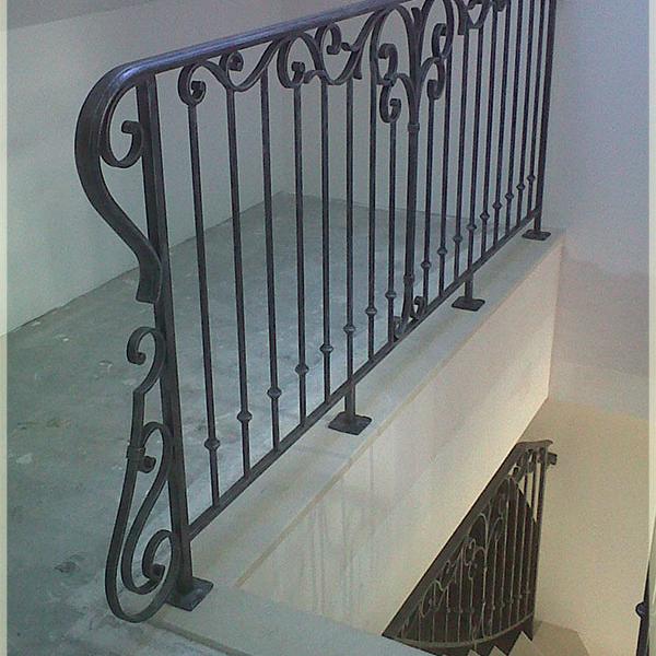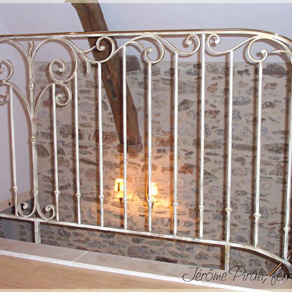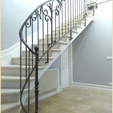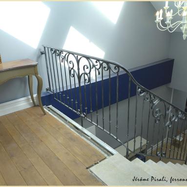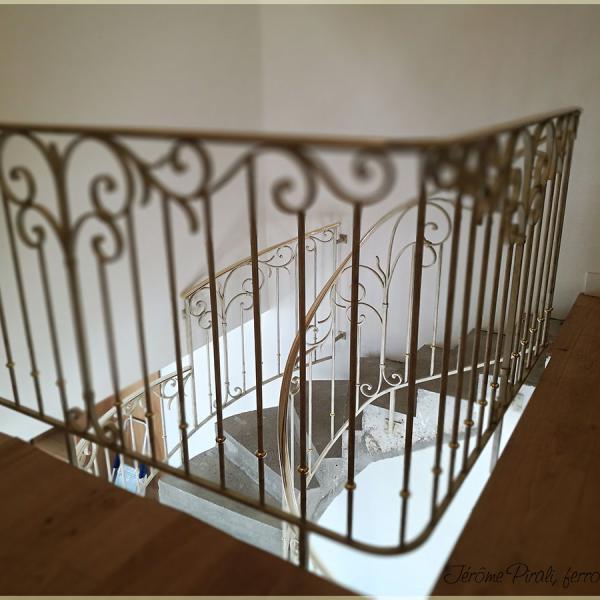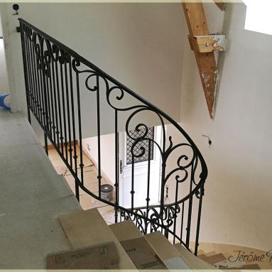 - rampe à barreaux en fer rond de 14 mm avec bagues en fonte plus décor en partie haute par volutes en fer plat de 20 x 8 mm avec noyaux forgés