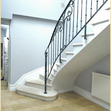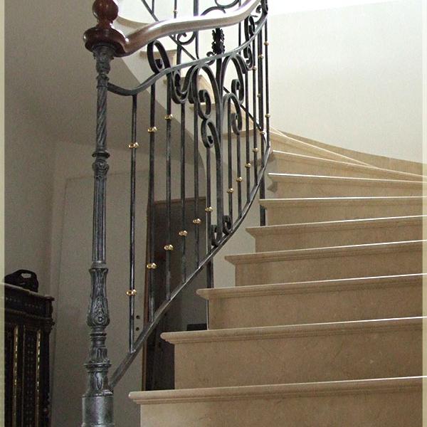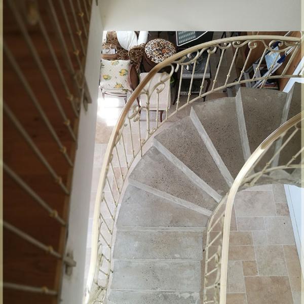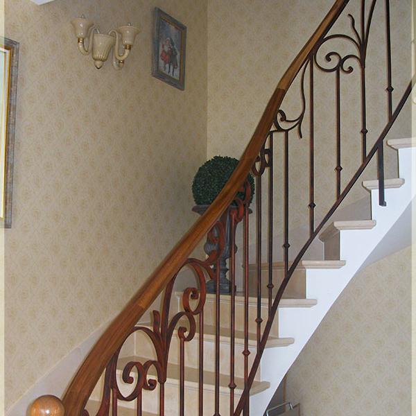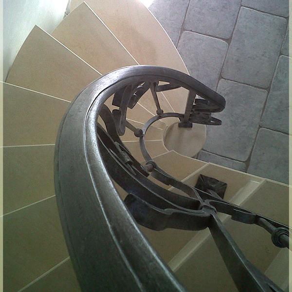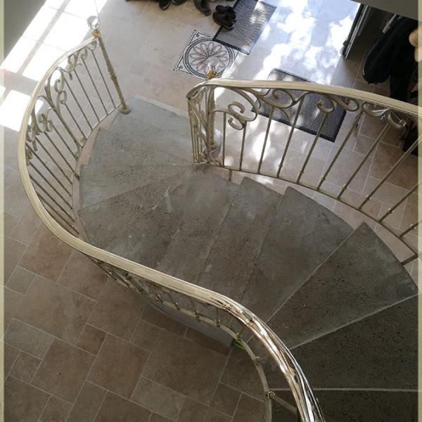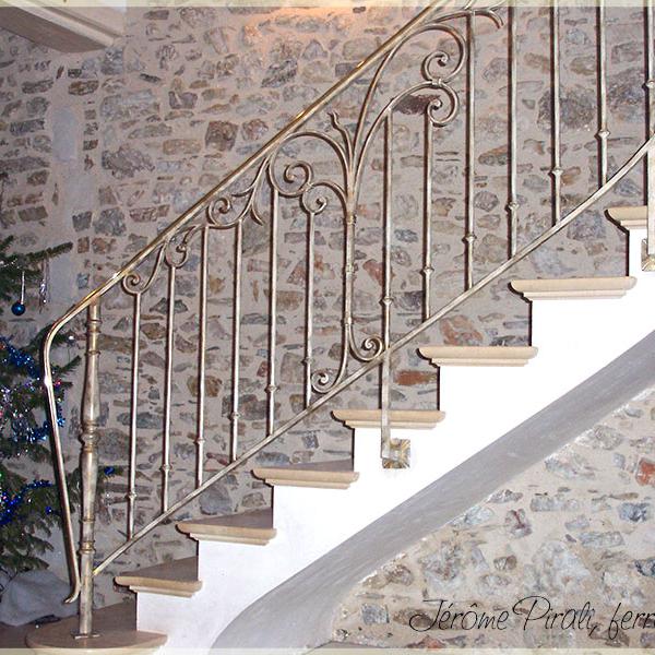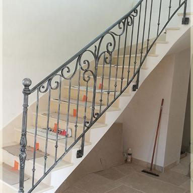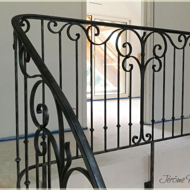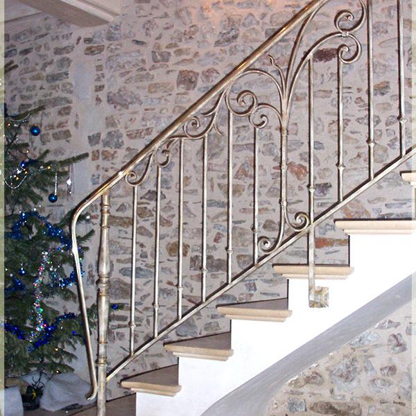 Ce modèle mixte barreaux plus volutes convient à tout type d'escalier. Sur cet escalier en pierre il a trouvé sa place.