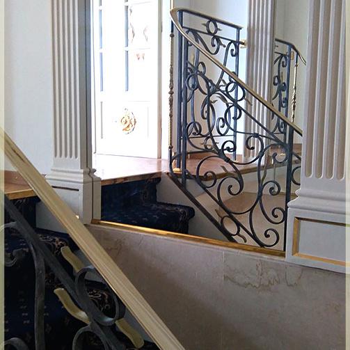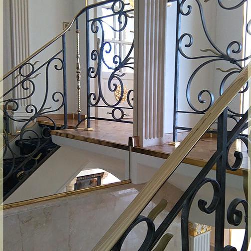 La composition de nos rampes : Lisse haute et basse en fer plat de 20x15 mm - Main courante en fer ou en laiton - Montants porteurs en fer carré de 20x20 mm - Décor en fer plat de 20x8 mm par volute - Barreaudage en fer rond de 14 mm.