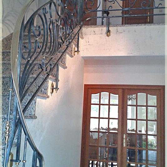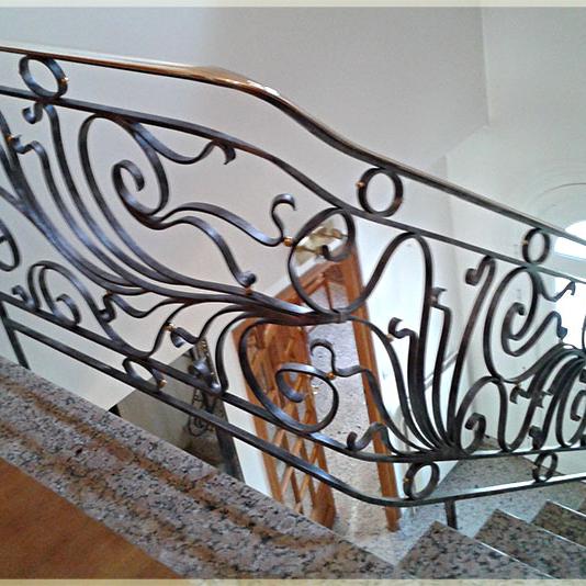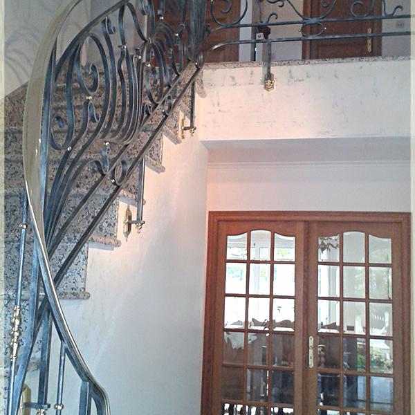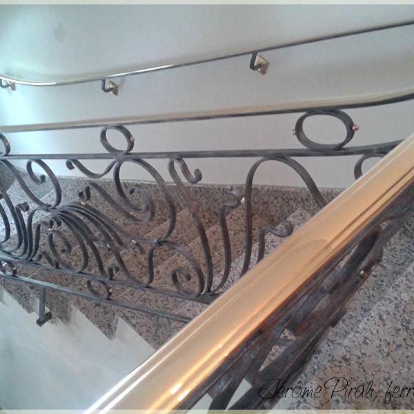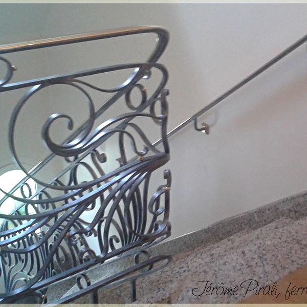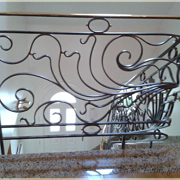 Cette rampe d'escalier aux motifs recherchés peut être réalisée par Jérôme Renaire, RJ Ferronnerie, partout en France.