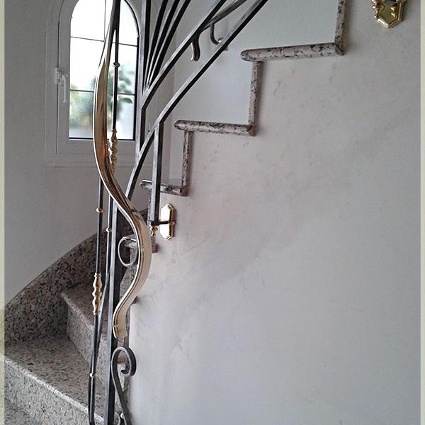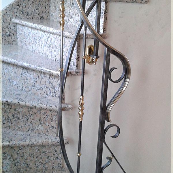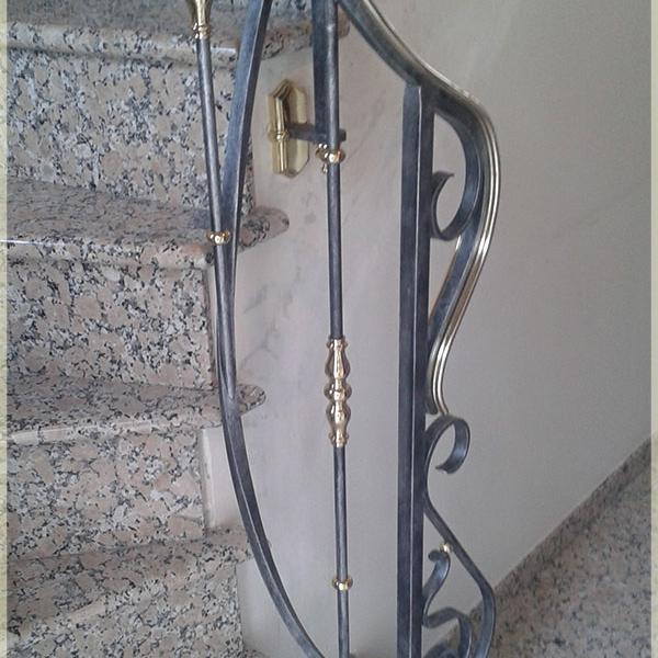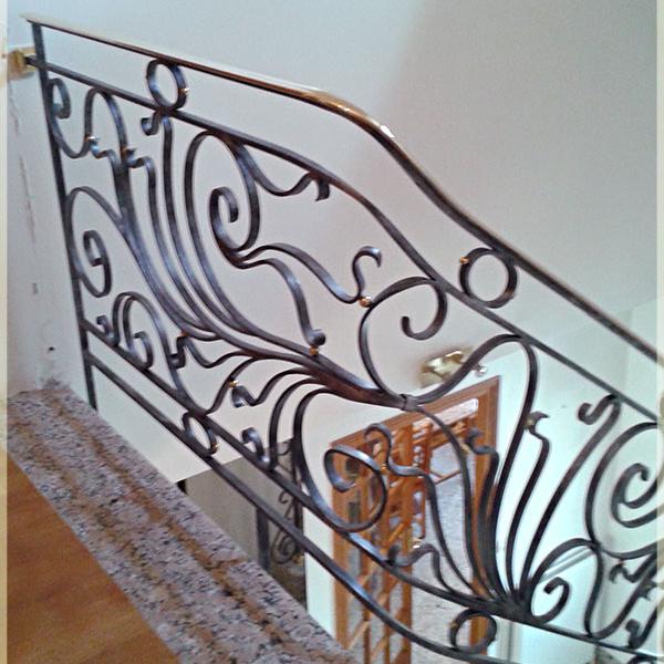 Rampe arabesque avec boules en laiton et volutes amincies à la forge