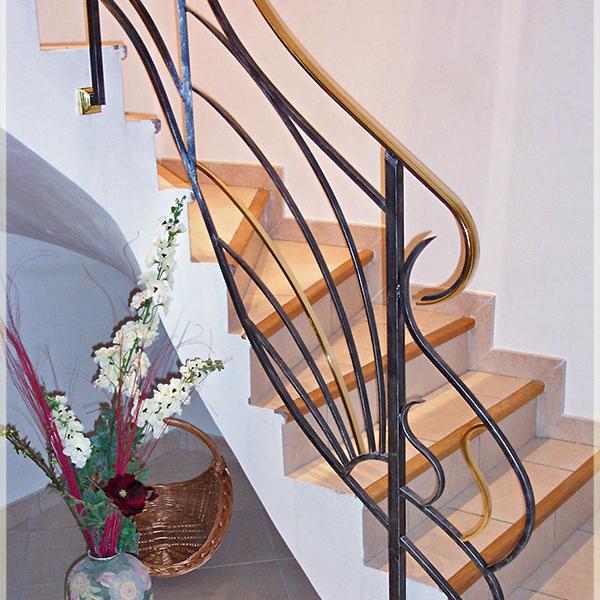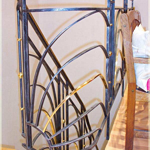 Le modèle Soleil est classé dans la catégorie des rampes d'escalier de style Art décoratif, c'est un modèle géométrique sobre et élégant dont le motif est fait d'un faisceau de fer plat et laiton. Il reste très prisé par nos clients recherchent un modèle très contemporain.