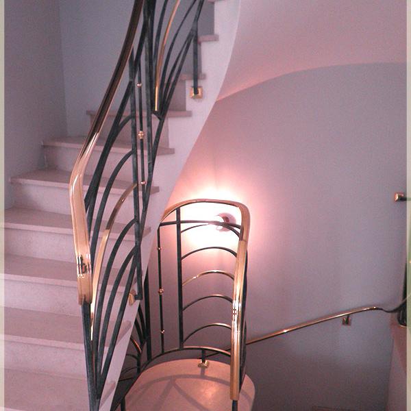 Ce modèle art déco va à ravir dans cet escalier, sa main courante en laiton poli et ces plats en laiton poli et vernis donnent de la chaleur à la rampe.